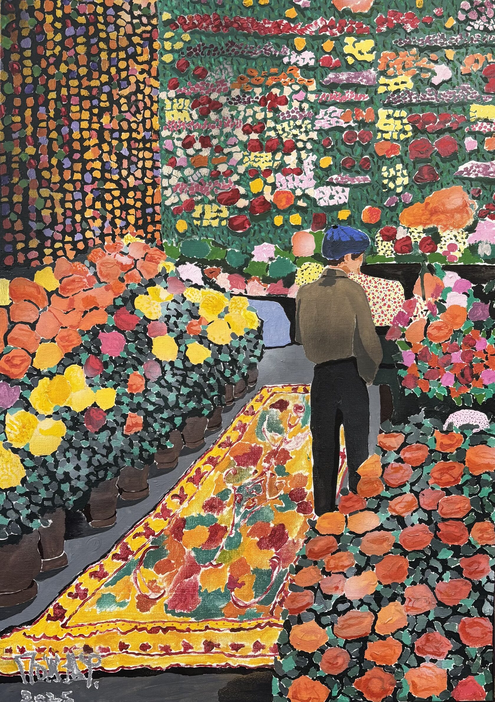На этой картине перед нами оживает тихая суета уличного рынка, где каждый предмет рассказывает свою историю. Ряды ярких купальников, развешанных на металлических стойках, кажутся почти театральной декорацией, за которой скрываются жизни их будущих владельцев. Цвета – насыщенные и жизнерадостные – напоминают о лете, свободе и море, которого жаждут горожане. Взгляд притягивают два персонажа: молодой продавец с задумчивым выражением лица, словно размышляющий о чём-то своём, и покупательница , одетая в небесно-голубую куртку, которая поглощённа выбором. Их молчаливый диалог кажется таким же значительным, как и товары, которыми они окружены. На переднем плане – граммофоны и виниловые пластинки, намекающие на атмосферу ностальгии. Это не просто рынок, а сцена, где прошлое встречается с настоящим. Позади – зелень деревьев, отражающая спокойствие природы, в контрасте с оживлённостью торгового ряда. Эта картина – как остановленный миг, момент повседневности, в котором скрыта целая вселенная. Зритель невольно становится участником этой истории, поддавшись магии деталей