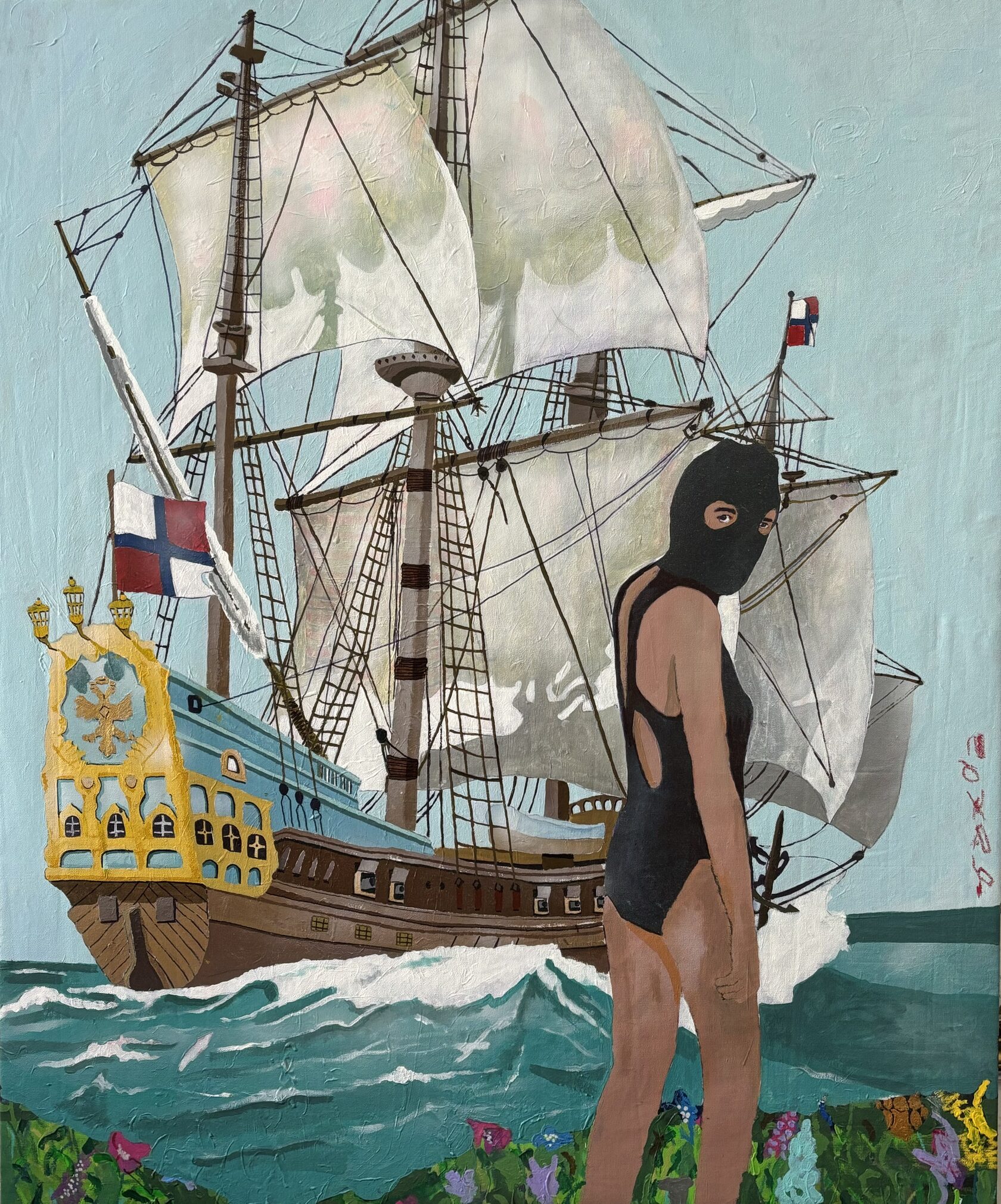 «Соль, пыль и порох девичьей дерзости» Словно сцена из сна усталого адмирала: корабль прошлого с флагами, пушками и позолотой идёт сквозь века, гордый и тяжёлый от своих побед и заблуждений. Он — память о старом мире, где всё давно было решено без нас. А перед ним — она. Современная, прямая, как выстрел. В чёрной балаклаве и закрытом купальнике — ни слабости, ни покорности. Её тело не защищено, но в ней — сила. Она — не туристка, не пленница, не спасённая. Она — знак. Как будто сама история вышла на берег, чтобы напомнить: «Теперь всё по-другому». Цветы под её ногами — как напоминание: жизнь прорастает даже там, где когда-то топтали сапоги. Она не ждёт корабль. Она не плывёт к нему. Она уже здесь. И с ней приходит новая правда — без флагов, без гимнов. Просто настоящая.